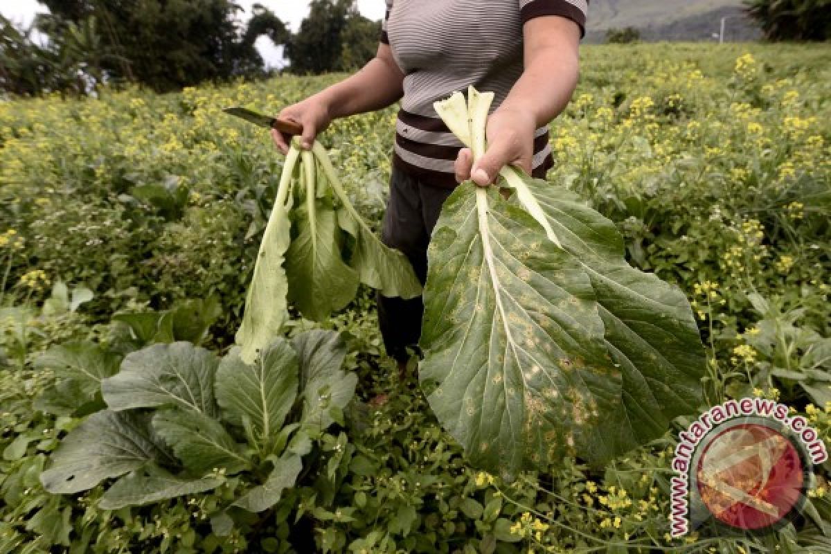 Seorang petani memperlihatkan sawi hijau hasil kebunnya yang rusak di lahan perkebunan Kaskasen, Tomohon, Sulawesi Utara, Senin (14/3). Curah hujan tinggi menyebabkan petani di desa tersebut memanen hasil kebunnya lebih awal, untuk menghindari kerugian akibat tanaman yang rusak. ANTARA FOTO/Adwit B Pramono/16.