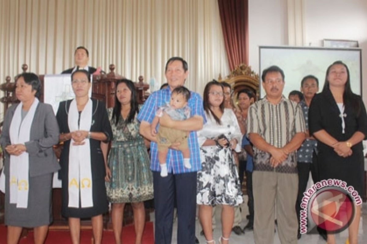 Manado (ANTARA Sulut) - Wali Kota Manado Vicky Lumentut, beribadah di GMIM Bukit Sion Pangalingan-Manado Tua, sekaligus menjadi orang tua Baptisan dari Gabriel Ramos Pangumpia, anak dari keluarga Pangumpia-Kasehung, Minggu (7/4).