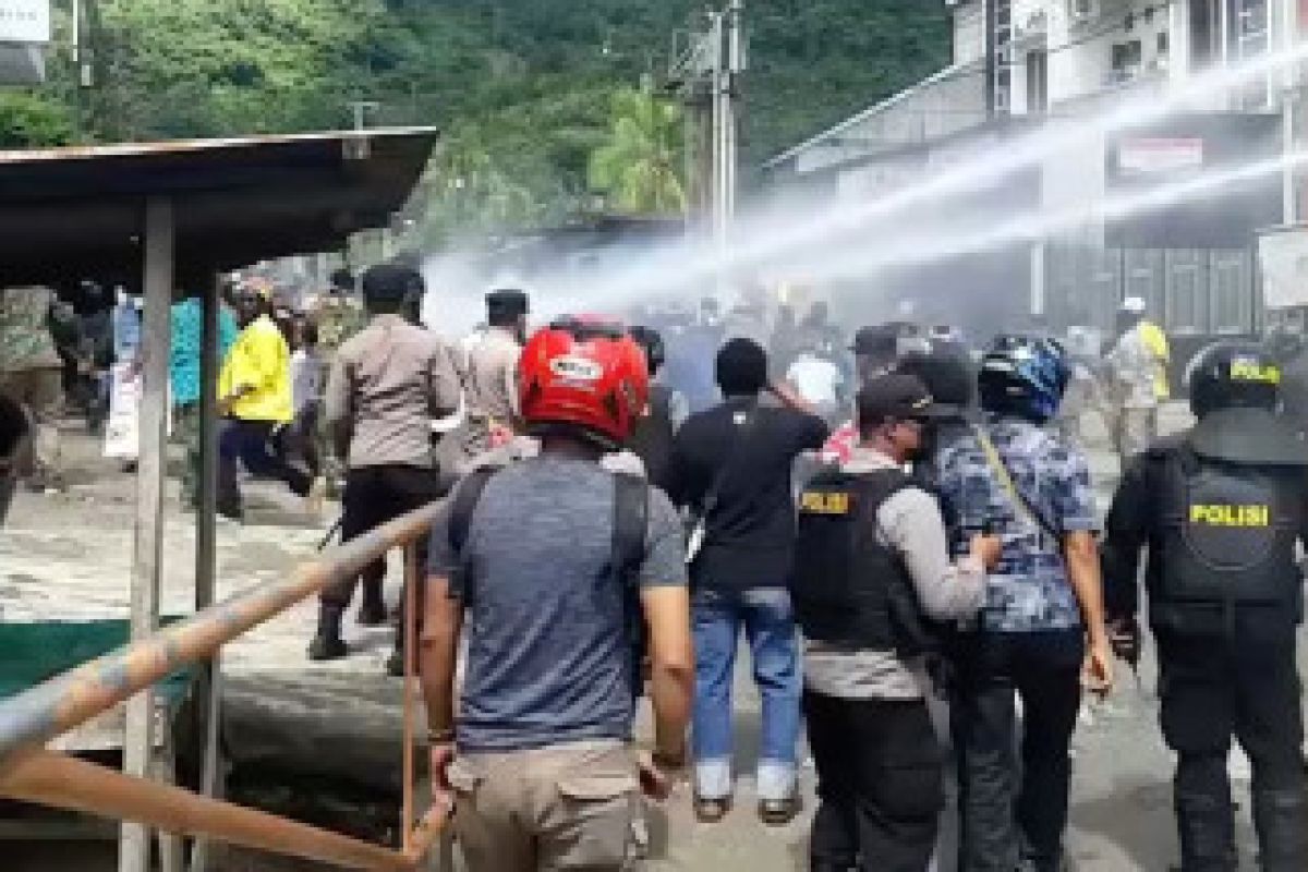 Aparat gabungan TNI dan Polri, Selasa (10/5), membubarkan secara paksa aksi unjuk rasa kelompok yang mengatasnamakan Petisi Rakyat Papua (PRP), di Kota Jayapura, Papua, yang menuntut penolakan pemekaran daerah otonomi baru (DOB). Pembubaran terpaksa dilakukan karena aksi tersebut tidak memiliki izin keramaian. (Laksa Mahendra/Yovita Amalia/Nusantara Mulkan)