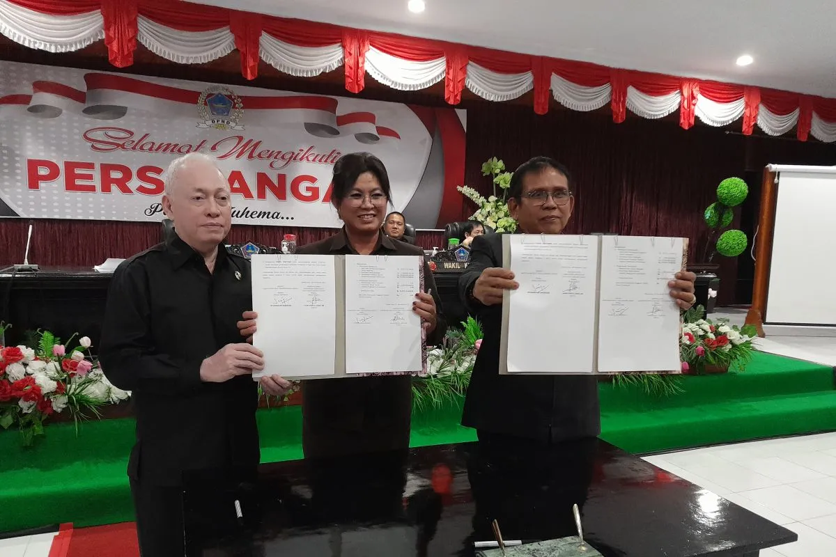 Sitaro (ANTARA) - Pemerintah Kabupaten Kepulauan Siau Tagulandang Biaro (Sitaro) dan Dewan Perwakilan Rakyat Daerah (DPRD)sepakati Rancangan Peraturan Daerah (Ranperda) tentang Anggaran Pendapatan Belanja Daerah (APBD) Tahun Anggaran (TA) 2023.Kesepakatan tersebut dilaksanakan dalam Rapat Paripurna DPRD dalam rangka persetujuan bersama penetapan RAPBD menjadi Peraturan Daerah APBD TA 2023, Senin (28/11), di Ruang Rapat Kantor DPRD yang dipimpin Djon P Janis selaku Ketua serta didampingi Bob N Janis dan Jotje Luntungan selaku Wakil Ketua.Persetujuan bersama diawali dengan rapat paripurna dalam rangka mendengar pendapat akhir fraksi yang disampaikan ketiga fraksi secara berturut-turut diantaranya Fraksi Golongan Karya (F-Golkar), Fraksi Persatuan Indonesia (F-Perindo) dan Fraksi Partai Demokrasi Indonesia Perjuangan (F-PDIP).Bupati Sitaro Evangelian Sasingen dalam sambutan mengapresiasi kepada semua pihak baik segenap pimpinan dan anggota DPRD serta tim anggaran pemerintah daerah yang sejak awal telah dilalui bersama penyampaian penjelasan Ranperda APBD TA 2023 hingga saat ini telah sampai pada penandatangan persetujuan bersama."Apresiasi kepada pimpinan dan anggota DPRD atas waktu, tenaga dan pikiran yang luar biasa dalam melaksanakan pembahasan dengan penuh ketelitian dan kecermatan sehingga Ranperda APBD TA 2023 pada hari ini dapat disetujui bersama antara pemerintah daerah dan DPRD untuk nantinya ditetapkan menjadi Peraturan Daerah," tukas bupati.Secara ringkas, lanjut bupati, APBD TA 2023 yang disetujui bersama adalah sebagai berikut pendapatan daerah kurang lebih Rp557 miliar. Kemudian belanja daerah kurang lebih Rp627miliar, defisit anggaran Rp70,572 miliar. Sedangkan untuk pembiayaan netto untuk menutup defisit anggaran adalah sebesar Rp70,572 miliar yang terdiri dari penerimaan pembiayaan sebesar Rp71,572 miliar, pengeluaran pembiayaan berupa penyertaan modal daerah sebesar Rp1 miliar."Selaku pimpinan daerah saya menyatakan menyetujui seluruh tahapan yangb telah dilaksanakan dan menyetujui Ranperda APBD Kabupaten Kepulauan Sitaro TA 2023 untuk ditetapkan menjadi peraturan daerah. Terimakasih untuk semua tekad dan komitmen yang baik serta kerjasama yang harmonis dari DPRD Sitaro dalam menyelesaikan tugas-tugas konstitusional termasuk membahas dan menyetujui Ranperda APBD TA 2023," kata bupati."Mari terus jaga kekompakan dan semangat kemitraan demi suksesnya program pembangunan di tahun anggaran 2023 yang merupakan tahun terakhir dalam pencapaian visi dan misi sesuai RPJMD 2018-2023, sekaligus menjadi tahun terakhir dalam kepemimpinan saya sebagai Bupati bersama pak Wakil Bupati John H Palandung," katanya lagi.kegiatan dilanjutkan dengan penandatangan nota persetujuan bersama antara pimpinan DPRD dan pimpinan daerah dalam hal ini Bupati Kepulauan Sitaro didampingi Wakil Bupati John H Palandung dan Sekretaris DPRD Sitaro, Masri Kasehung. Turut hadir para anggota DPRD, Sekretaris Daerah Denny D Kondoj, pimpinan OPD, Kabag, Camat, Lurah dan Kapitalau se-Sitaro.