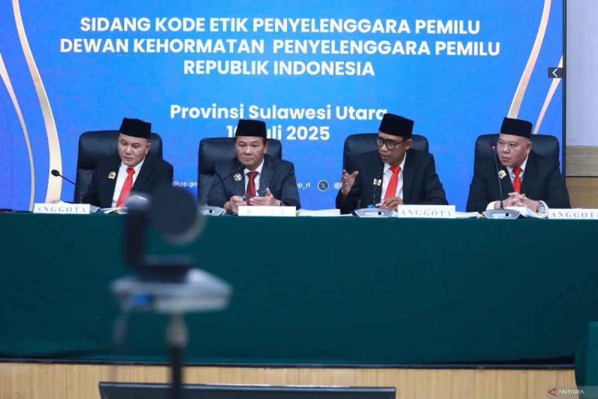 Manado (ANTARA) - Dewan Kehormatan Penyelenggara Pemilu (DKPP) memeriksa Ketua dan dua Anggota Bawaslu Kabupaten Kepulauan Talaud, dalam dalam sidang pemeriksaan dugaan pelanggaran Kode Etik Penyelenggara Pemilu (KEPP) untuk perkara Nomor 144-PKE-DKPP/IV/2025 yang dilaksanakan secara hibrida, Kamis.