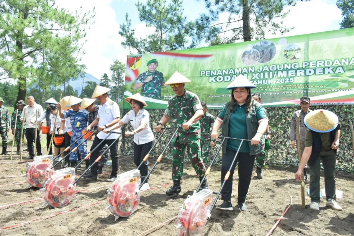 Kasdam XIII/Merdeka bersama pejabat utama Kodam mengikuti seluruh rangkaian acara, mulai dari peninjauan area lahan, penanaman jagung perdana hingga pemberian bingkisan bahan kebutuhan pokok kepada masyarakat setempat.