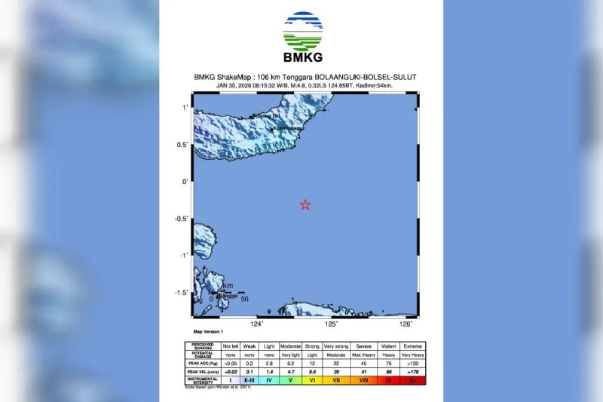 Pada Jumat (30/1) pagi pukul 08.15.29 WIB wilayah Teluk Tomini, Sulawesi Utara diguncang gempa tektonik M5,1, yang kemudian dari hasil analisis BMKG menunjukkan gempa bumi ini memiliki parameter update dengan magnitudo M4,8.