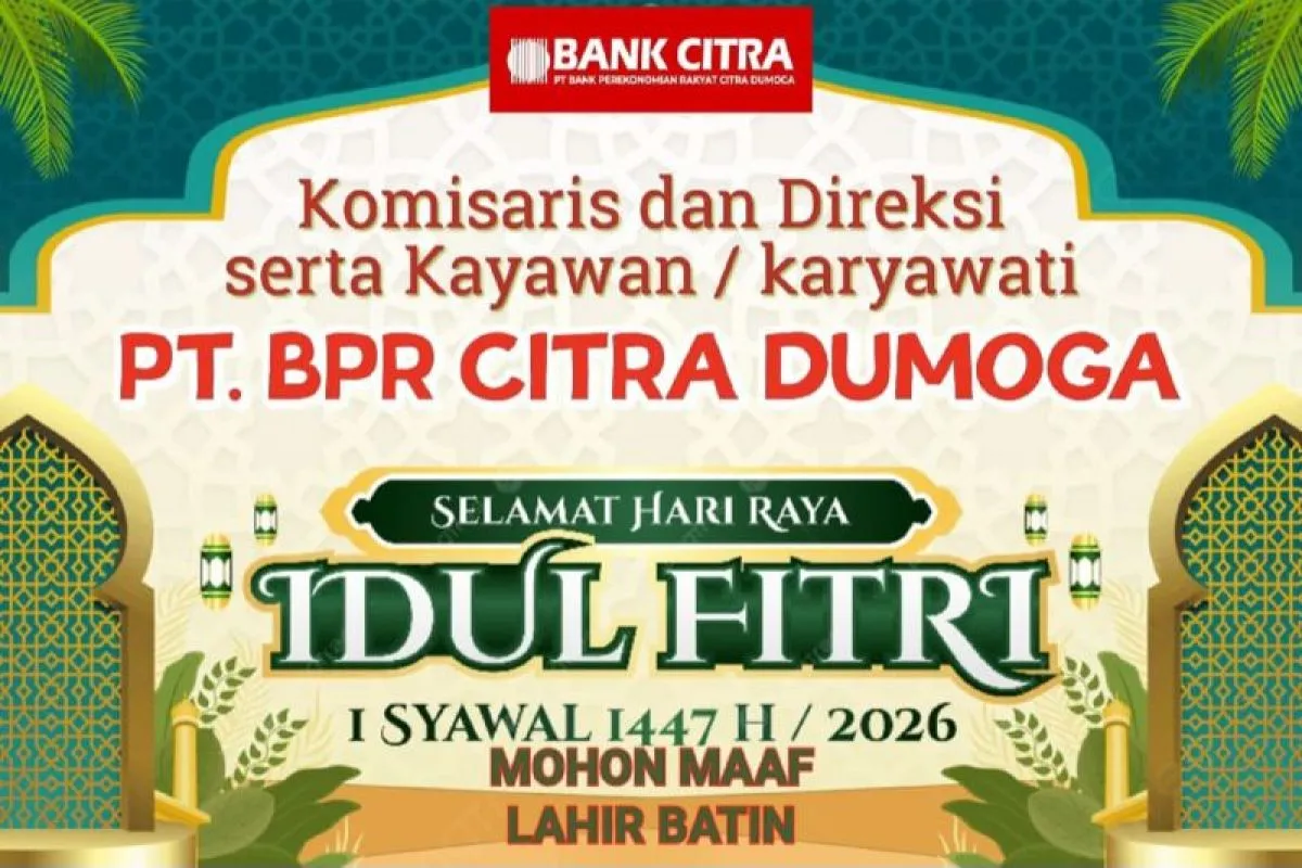 Pimpinan dan Karyawan Bank Citra menyampaikan selamat merayakan Idul Fitri 1447 H, mohon maaf lahir dan bantin.