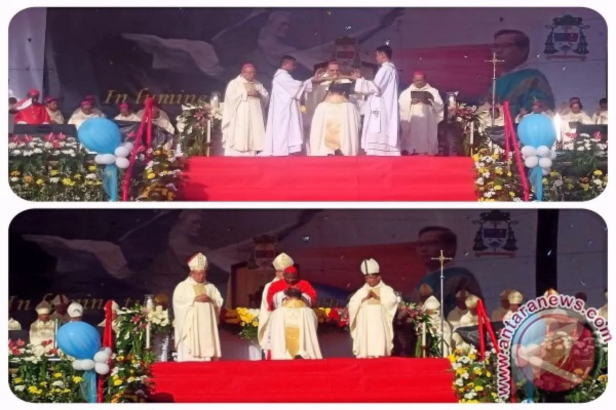 Tondano (AntaraSulut) - Prosesi pentahbisan Uskup Manado terpilih Mgr Benedictus Estephanus Untu MSc dihadiri sekitar 20 ribu umat, termasuk uskup seluruh Indonesia, Duta Besar (Dubes) Vatikan untuk Indonesia Mgr Antonio Guido Filipazzi, Kardinal Mgr John Ribat asal Papua New Guinea. Pelaksanaan berlangsung di Stadion Maesa Tondano, Sabtu (8/7).