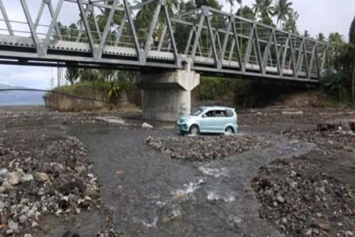 TAHUNA, 19/2 - LAHAR MALA. Pengendara menggunakan jalur alternatif sebelum pengoperasian jembatan Lahar Mala di Tahuna, Kabupaten Sangihe, Sulawesi Utara, Jumat (9/12). Jembatan dengan panjang 100 meter tersebut sangat membantu dan memudahkan untuk berhubungan dengan wilayah lain di daerah kepulauan. FOTO ANTARAManado/Basrul Haq/10.