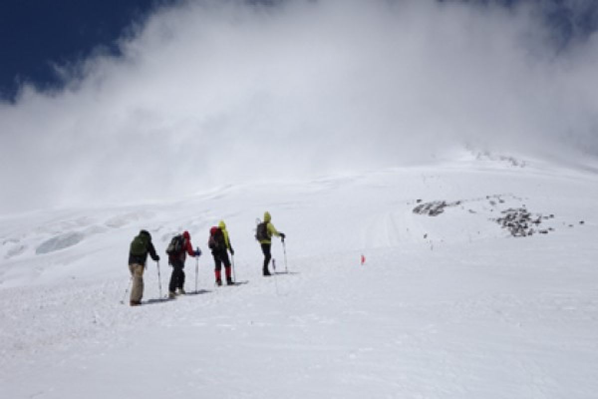 Tim The First Indonesia Woman On Seven Summits Of The World Expedition, Inka Wangko (kiri dua) dan Jelita Karomoy (kiri tiga) asal Sulut mendaki pada ketinggian "summit atack" 5.100 mdpl, di Gunung Elbrus, Caucasus, Rusia, Selasa (27/8). Sebelumnya dua wanita tersebut telah menakluhkan gunung Carstensz Pyramid di Papua pada Oktober 2012 lalu dan selanjutnya akan menakluhkan lima gunung di dunia. FOTO ANTARA/Fs/ Tim The First Indonesia Woman On Seven Summits Of The World Expedition/13.