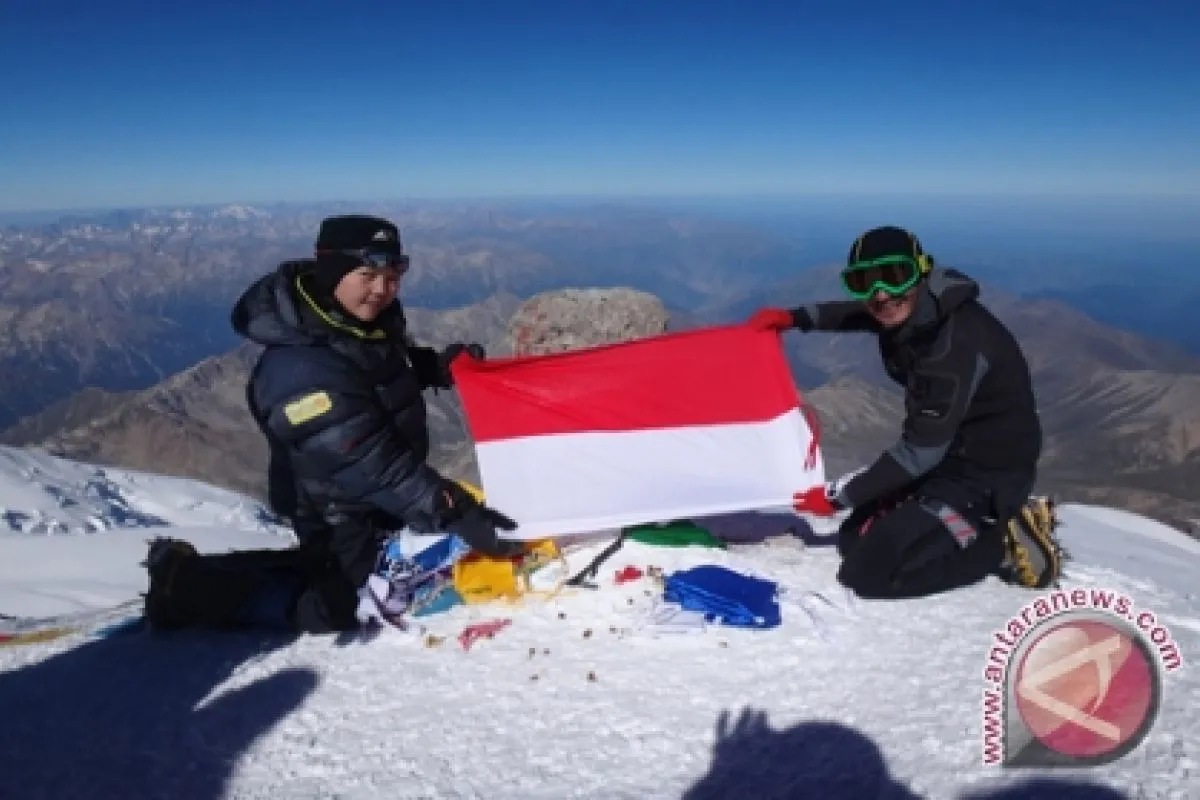 Tim The First Indonesia Woman On Seven Summits Of The World Expedition, Jelita Karomoy (kiri) asal Sulut membentangkan bendera merah putih ditemani pendaki lainnya ketika mencapai puncak pada ketinggian 5.642 mdpl, di Gunung Elbrus, Caucasus, Rusia, Jumat (29/8). Sebelumnya dua wanita tersebut telah menakluhkan gunung Carstensz Pyramid di Papua pada Oktober 2012 lalu dan selanjutnya akan menakluhkan lima gunung di dunia. FOTO ANTARA/Fs/ Tim The First Indonesia Woman On Seven Summits Of The World Expedition/13.