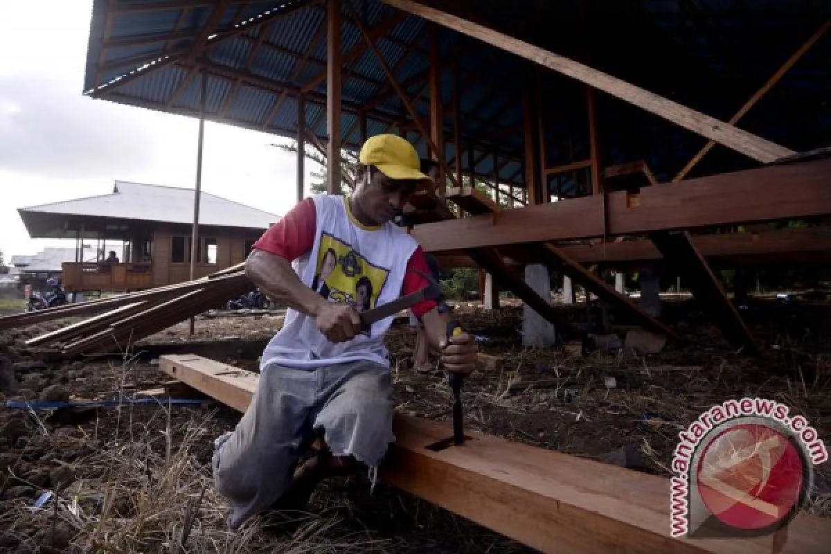 Pekerja menyelesaikan pembuatan rumah kayu khas Minahasa di desa Woloan, Tomohon, Sulawesi Utara, Kamis (10/3). Rumah panggung dengan metode knock-down atau bongkar pasang tersebut, merupakan salah satu komoditas ekspor Sulawesi Utara ke sejumlah negara, seperti Malaysia, Maladewa dan Tanzania. ANTARA FOTO/Adwit B Pramono/nz/16.