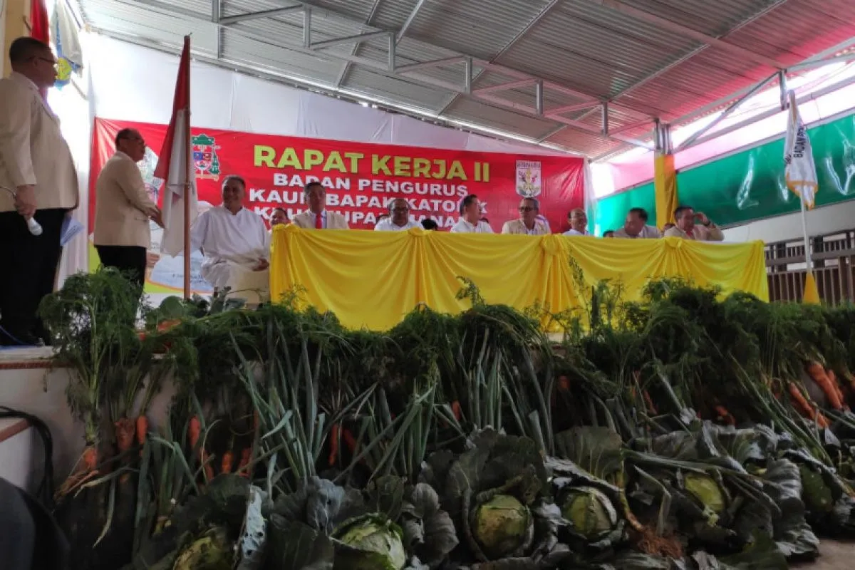 Sinisir, Modoinding (ANTARA) - Pelaksanaan rapat kerja ke-2 Badan Pengurus Kaum Bapak Katolik(KBK) Keuskupan Manado yang berlangsung di Paroki Sta Perawan Maria Ratu Rosari Modoinding diwarnai hal menarik, yakni untuk hiasan panggung pimpinan rapat dihiasi berbagai jenis sayuran yang diproduksi petani di daerah itu.