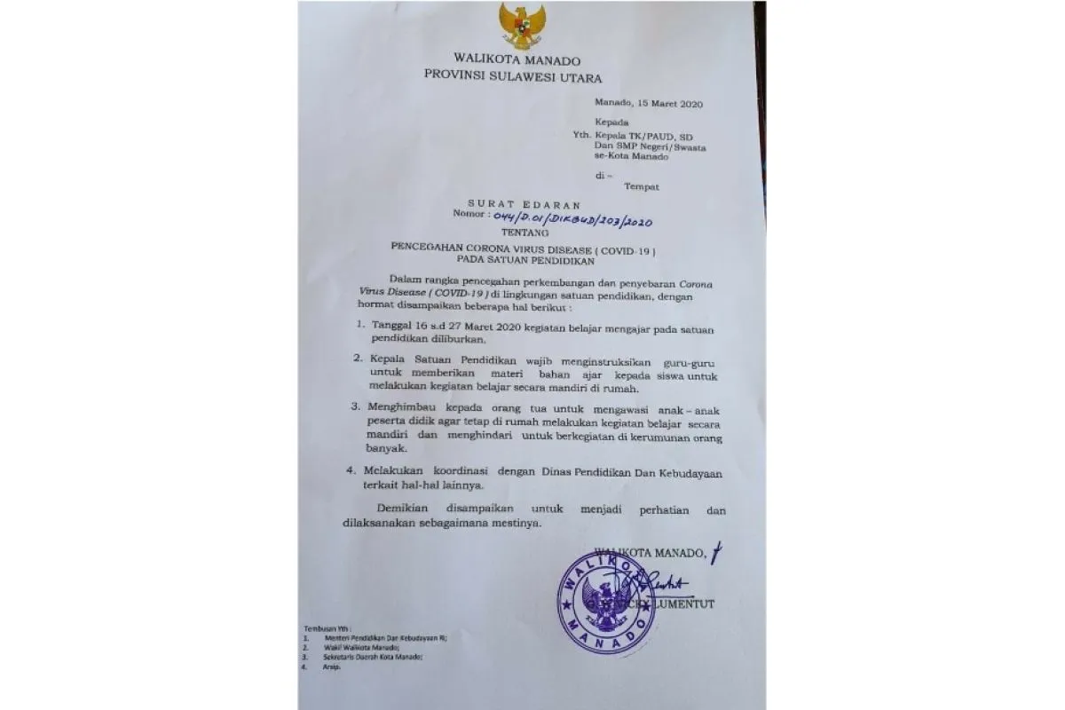 "Wali Kota Manado Dr. Vicky Lumentut, telah mengeluarkan surat edaran bernomor 044/2020 yang berisikan tentang memindahkan kegiatan belajar dari sekolah ke rumah selama dua pekan mulai TK - SMP negeri maupun swasta," kata kepala bagian humas Pemkot Manado Sonny Takumansang, di Manado.