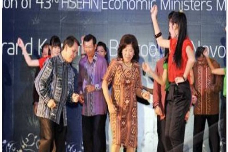 MANADO, SULUT, 11/8 - TARI POCO-POCO. Menteri Perdagangan RI Mari Elka Pangestu (2 kanan) menari Poco-poco khas Manado bersama Gubernur Sulut S. H Sarundajang (kiri) dan Menteri Perdagangan Kamboja Cham Parasidh (2 kiri) saat jamuan makan malam di sela-sela pelaksanaan petemuan menteri-menteri ekonomi ASEAN (AEM) ke-43 di Grand Kawanua International Convention (GKIC) Manado, Sulut, Kamis (11/8) malam. FOTO ANTARA/Basrul Haq/pd/11